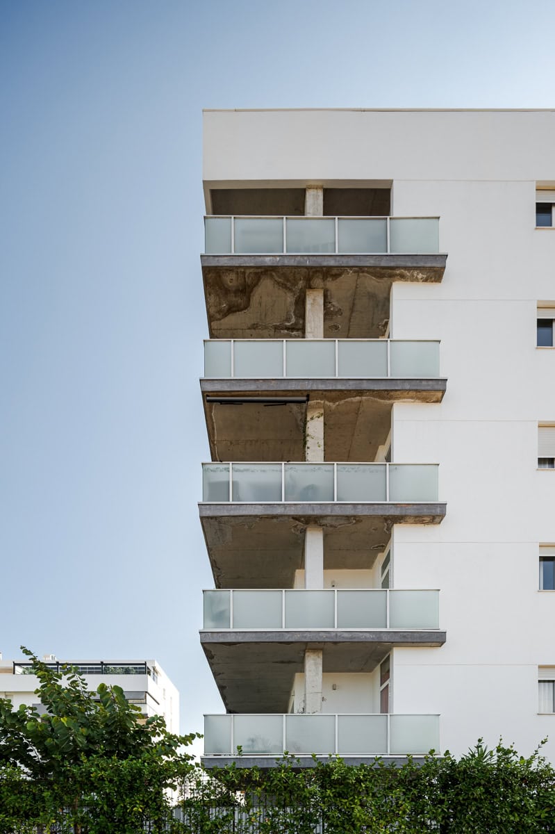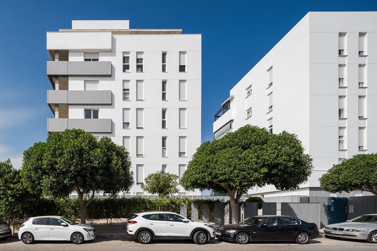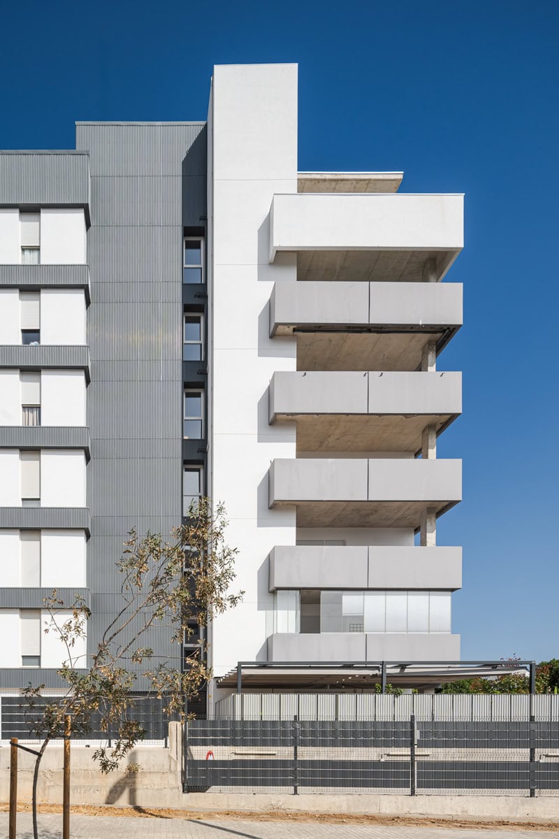 Los bloques se materializan mediante un conjunto de amplias terrazas que abrazan su propio volumen orientándose hacia el espacio central, jugando con paneles prefabricados de hormigón y barandillas de vidrio que aportan dinamismo a las fachadas. Para romper la horizontalidad del conjunto, surgen una serie de núcleos verticales cubiertos de chapa metálica grecada que contrastan con el blanco de los bloques.